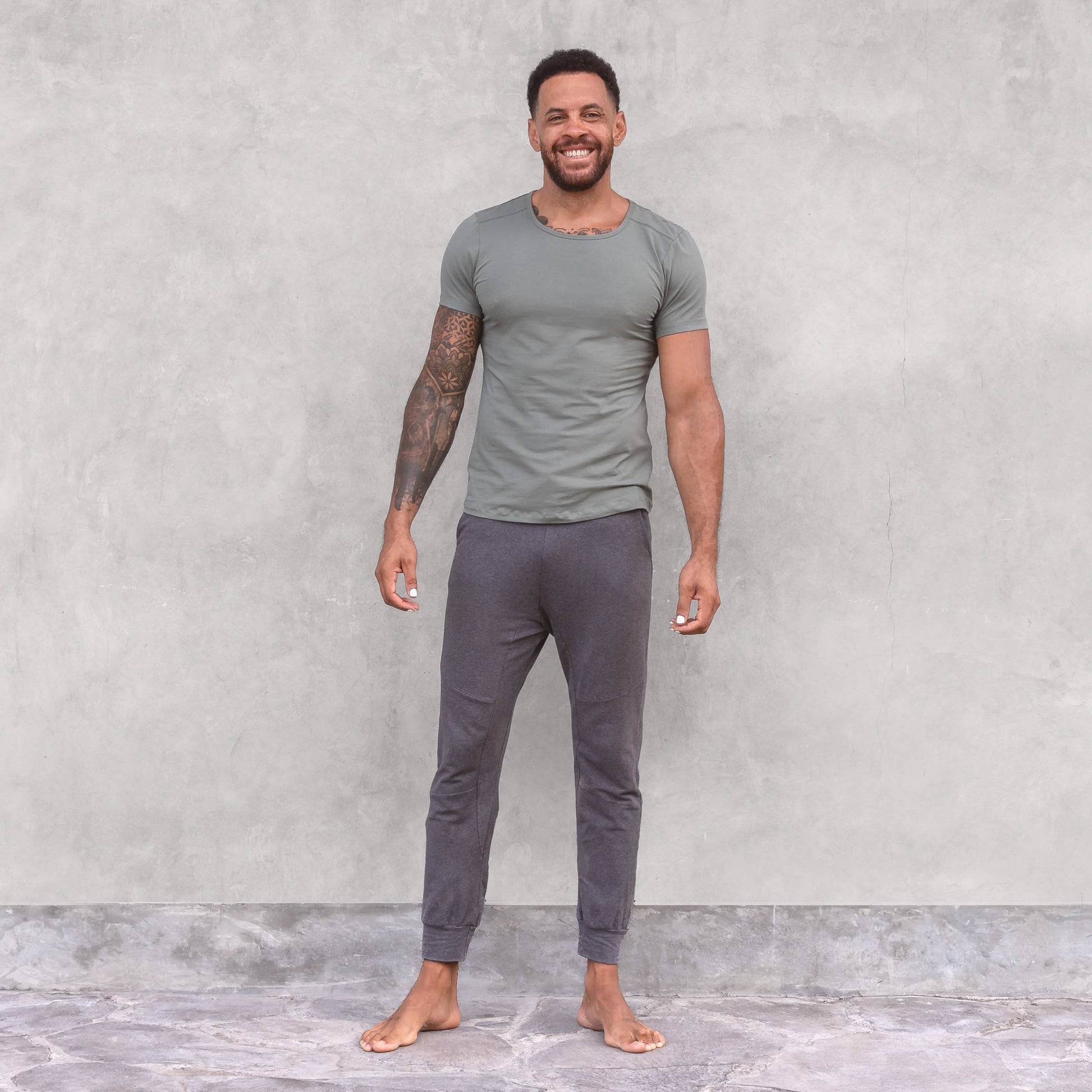 T-shirt da uomo Bodyfit per yoga e uso quotidiano in un mix di cotone organico e lycra piacevolmente leggero con cucitura extra sulle spalle e piccolo logo «JAY» stampato sulla manica.